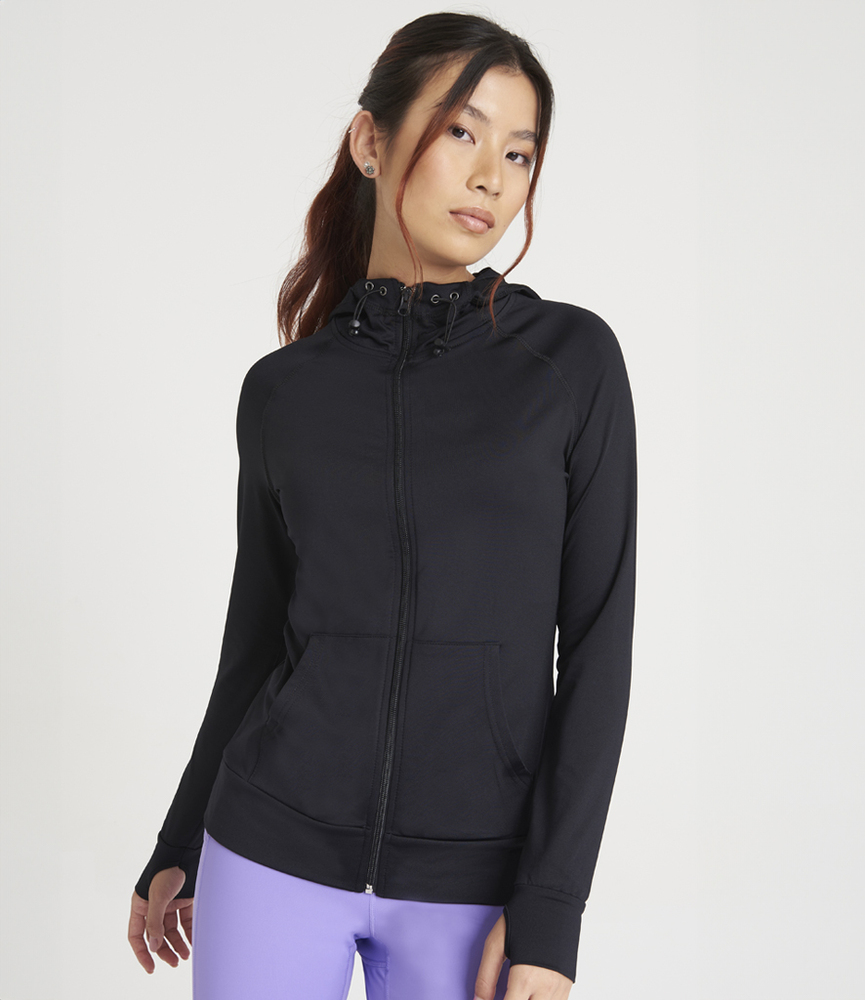 Hood and sleeves 92% polyester/8% elastane. DynamicCool™ responsive blended fabric. Contrast melange effect grown on adjustable hood and raglan sleeves. Taped neck. Full length zip. Front pouch pockets.