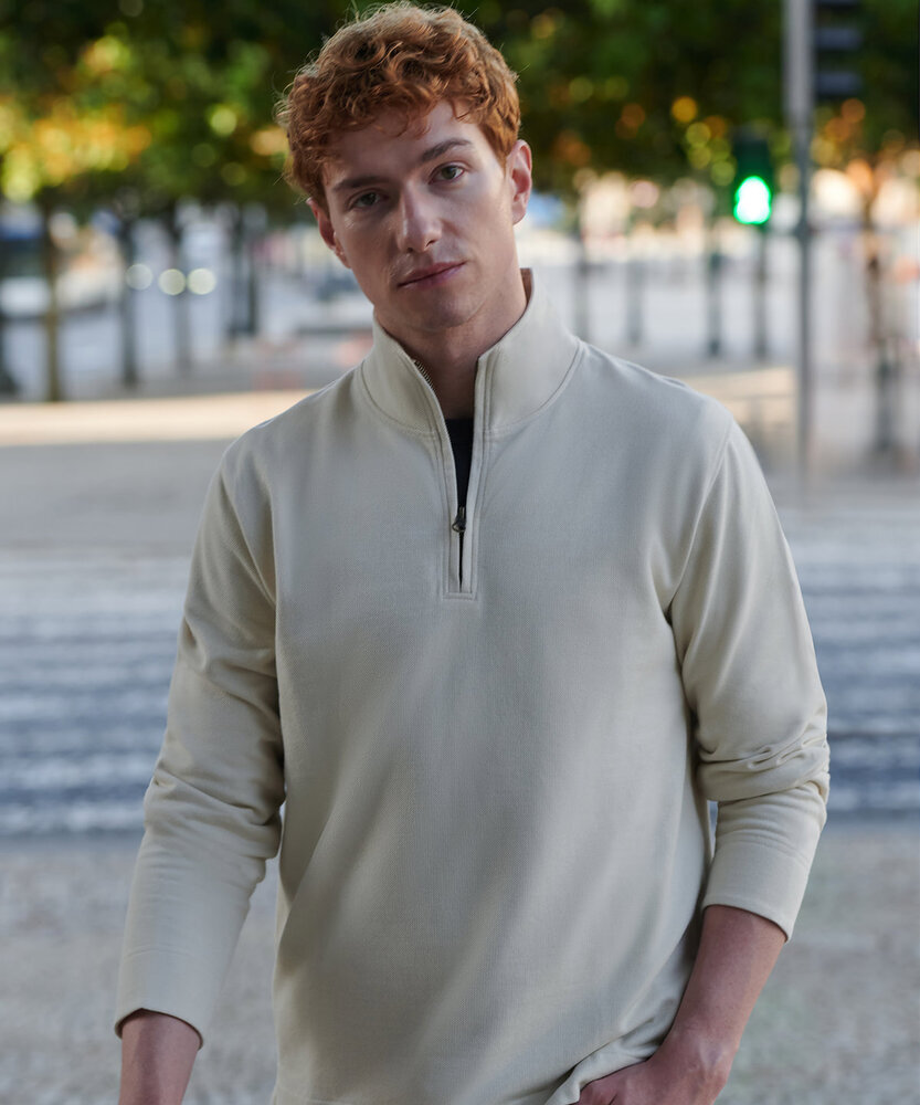 Premium 1/4-zip top, regular fit. Durable piqué front fabric, with brushed back fleece. Antique brass centred zip. Woven collar facing. Flatlocked seams at cuffs. Rear-locker patch. Stepped hem with woven facing. Side vents with herringbone tape. Tag-free for easy rebranding.