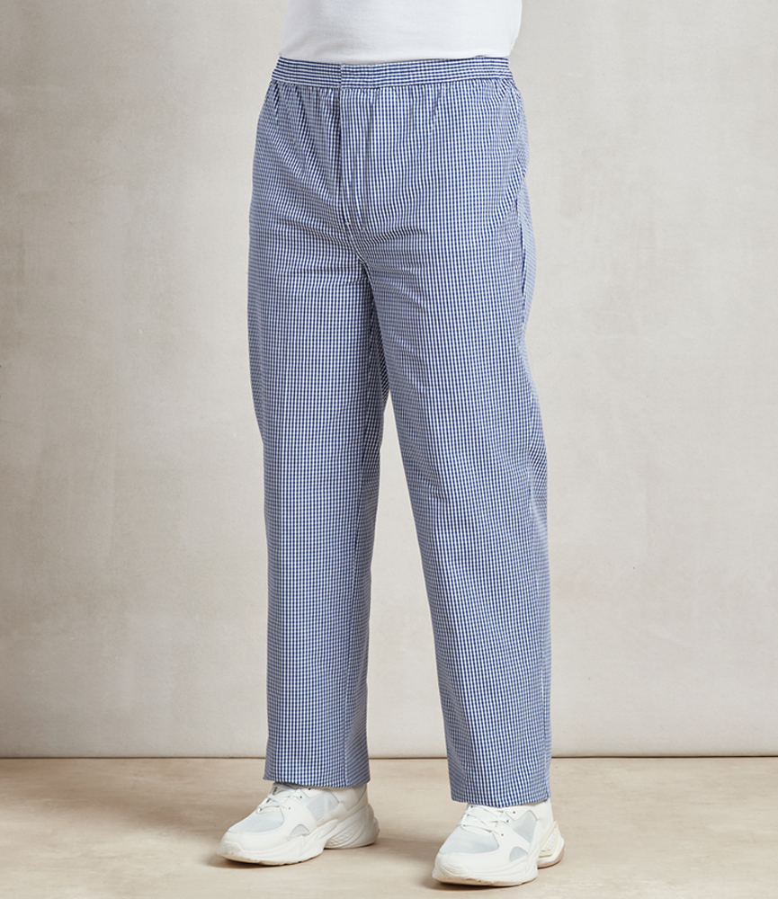 65% polyester/35% cotton with woven checks. Easy care fabric. Unisex styling. Elasticated waistband. Zip fly. Rear patch pocket. Industrial laundry 85°C. Domestic wash 60°C.