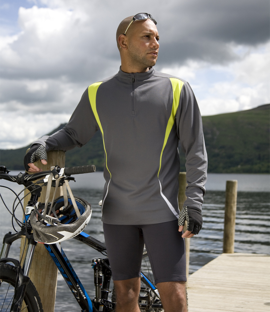 100% polyester. Cool-Dry© mesh panels.Breathable.Fabric is moisture wicking and quick dry.Mandarin collar.Zip neck with chin guard and inner zip guard.Contrast panel detail on front and back.Contrast print on sleeves.Cover stitching.
