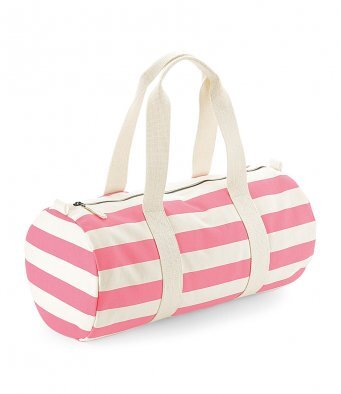 100% brushed cotton canvas. Printed stripe design. Webbing carry handles. Main zip compartment. Capacity 20 litres.