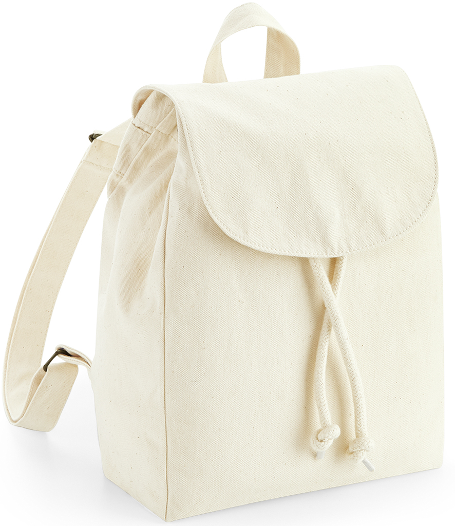 100% organic cotton canvas. Premium heavyweight fabric. Grab handle. Self fabric adjustable shoulder straps. Fold over flap with press stud. Rope drawcord closure. Capacity 5 litres.