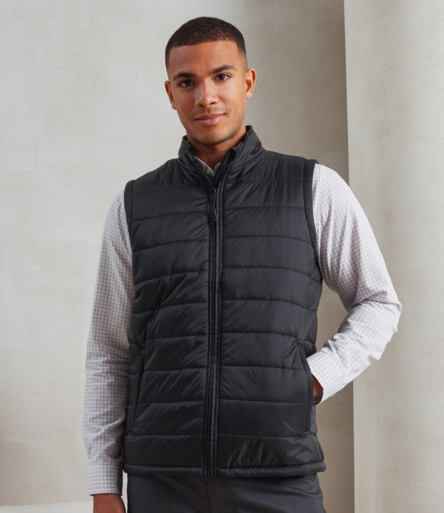 Recycled nylon outer. Recycled polyester lining and padding. Easy care fabric. Shower resistant. Lightweight. Full length zip. Two front zip pockets. Inner pocket. Packs away into stuff sack. Zip access for decoration.