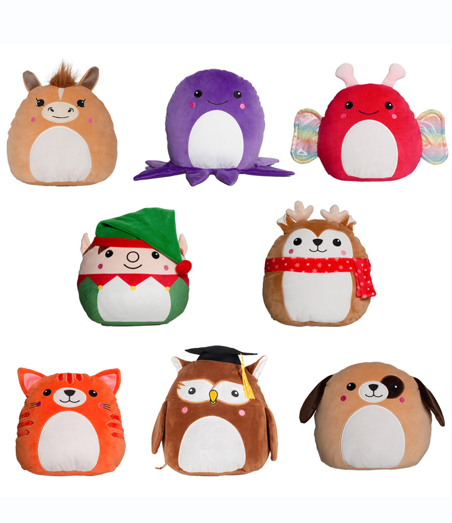 95% polyester/5% elastane. Soft plush animal toys - butterfly, christmas deer, dog, ginger cat, octopus, owl, pony, pumpkin, penguin and christmas tree. Height ranges from 29cm up to 36cm. Zip access for decoration onto front panel. Removable inner pad.