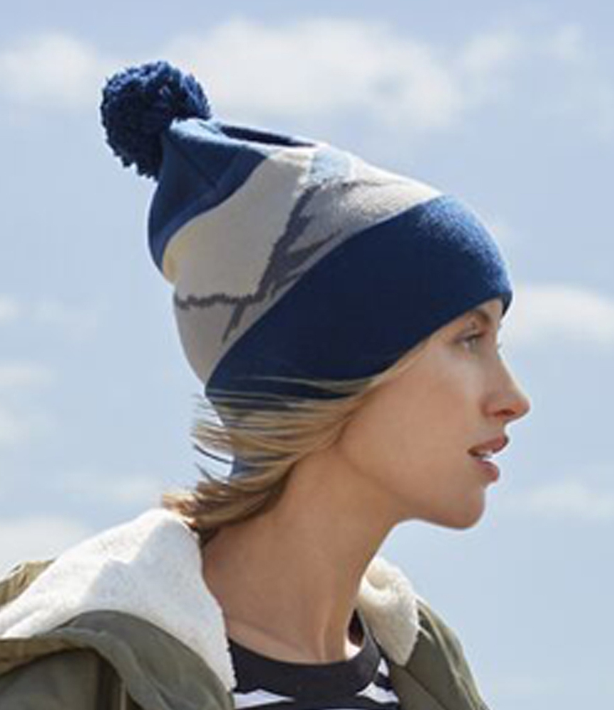 95% recycled polyester/4% nylon/1% elastane. Double layer knit.Cuffed design.Self colour pom pom.Bold mountain scape design.Tear out label.