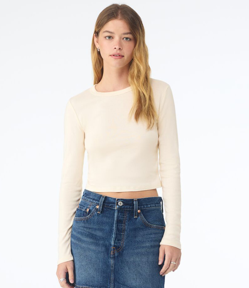 90% airlume combed ringspun cotton/10% polyester. Pre-shrunk.Fitted style.1x1 micro rib.Bound neckline.Side seams.Cropped length.Tear out label.