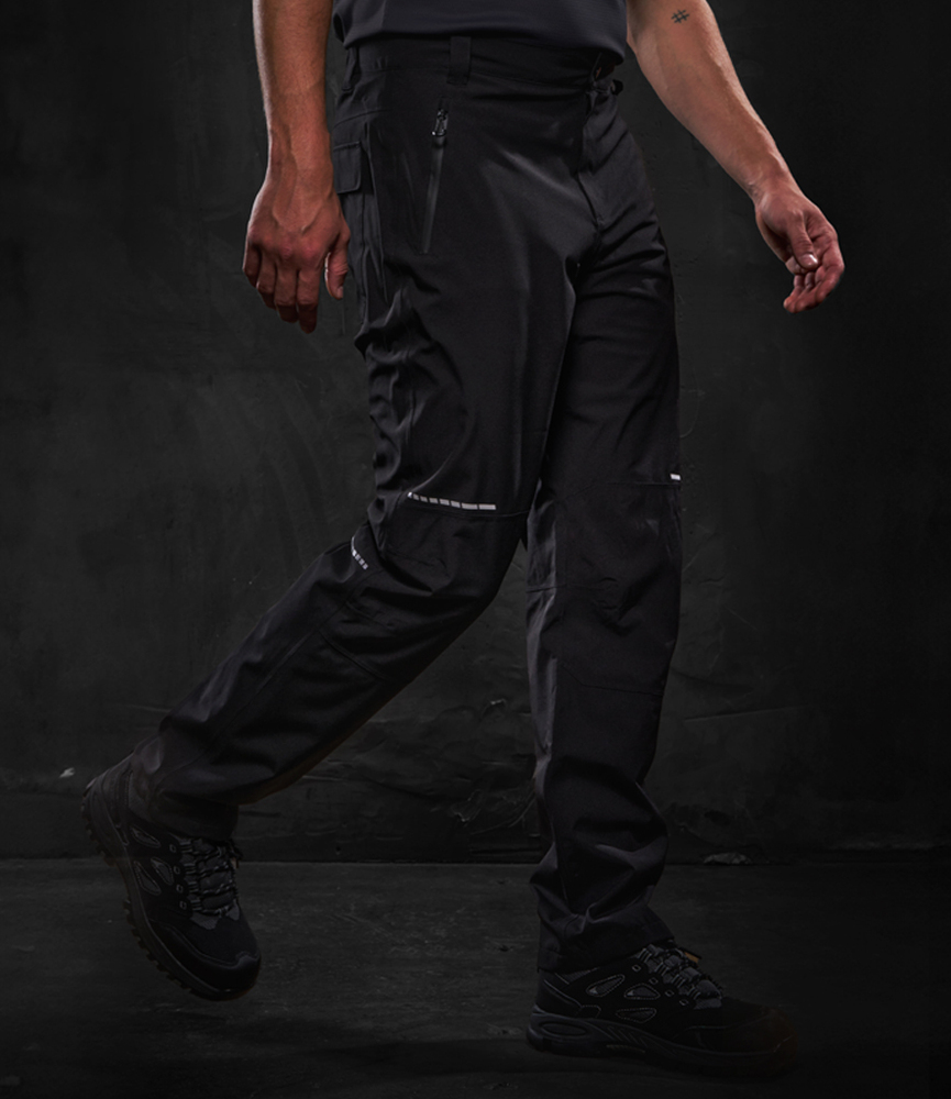 Isotex® 10000 recycled polyester stretch outer. Recycled polyester lining. Conforms to EN343: 2003 A1: 2007 class 3:2. Waterproof with taped seams. Breathable. Part elasticated waistband with belt loops. Zip fly with stud over. Two waterproof side zip pockets. Left thigh waterproof zip pocket. Rear patch pocket with flap. Articulated knee design. Reflective print detail.
