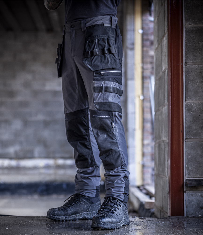 92% nylon/8% elastane. Four-way stretch. Hardwearing stretch ripstop panels. ATL durable showerproof finish. Laser cut ventilation. Slim fit. Part elasticated waistband with belt loops. Zip with metal shank button over. Detachable holster pockets. Crotch gusset. D-ring. Multi-use front pockets. ID holder. Hammer loop. Ruler pocket Rear pockets. Cordura® bottom loading knee pad pockets. Reflective detail. Triple stitched seams. Extendable leg ends short 29" to reg 31". Knee pads available RG282.
