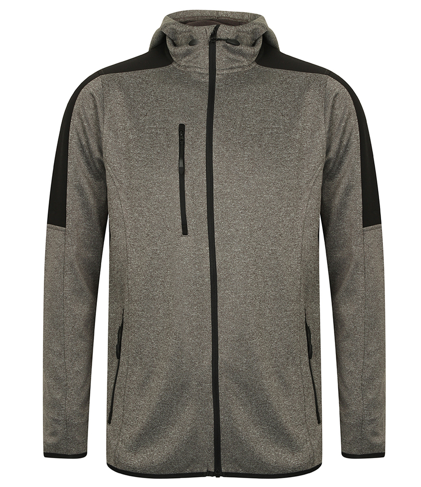 Two layer soft shell. 100% polyester. Soft jersey fabric with bonded micro fleece reverse. Three panel hood. Contrast shoulders and upper sleeve panels. Full length contrast zip with non-slip gripper zip pulls. Contrast right chest and two front zip pockets. Top stitched side panels. Stretch bound cuffs and hem. Drop hem.