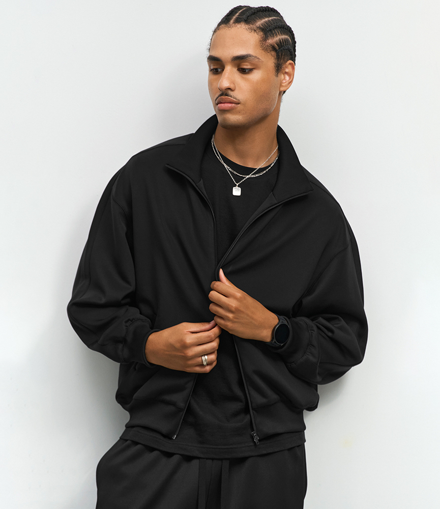 Relaxed fit.Dropped shoulders.2x2 ribbed high collar, cuffs and hem.Full length nylon zip.Two front welt pockets.Self colour stripe along the sleeves.Tear out label.